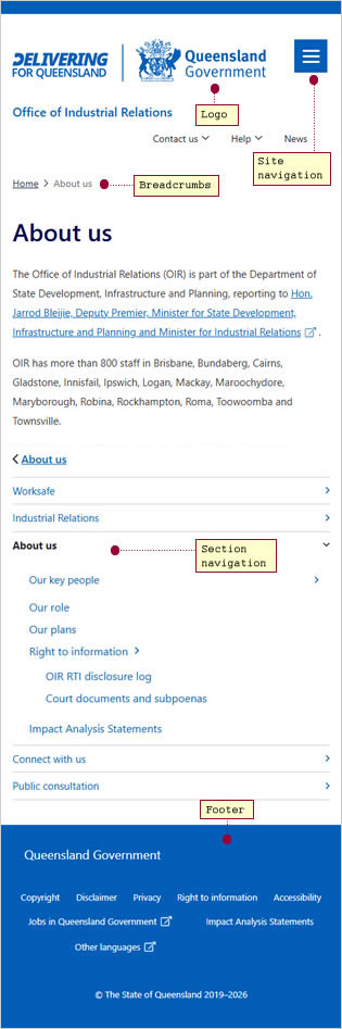 The section navigation menu shows links to other pages within the same section of the website. The menu appears in the left column of all oir.qld.gov.au pages.